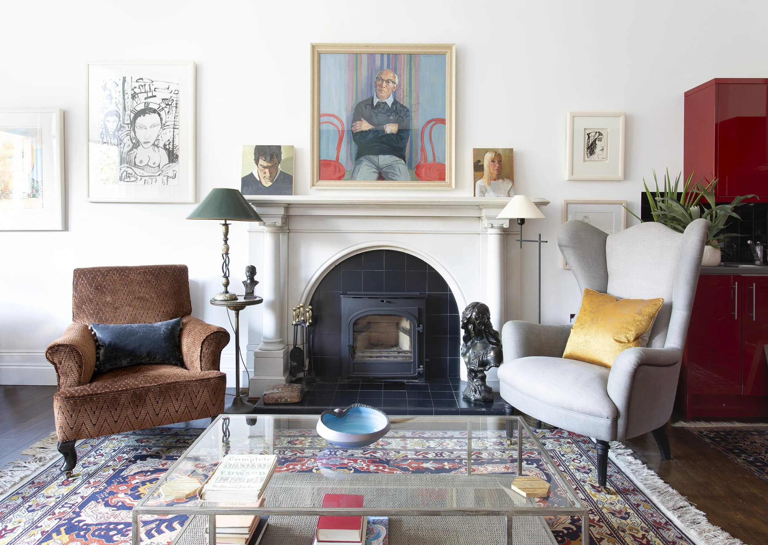 Living room with white walls, a fireplace, and two armchairs, one brown and one gray, with decorative pillows. A glass coffee table holds books and a bowl. Artwork decorates walls above the fireplace, including portraits and abstract pieces. A lamp s